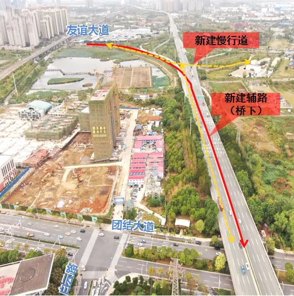武漢站東廣場配套骨架路網(wǎng)提升工程位于三環(huán)線紅線范圍內(nèi),主要包括新建三環(huán)線輔路和慢行道。新建三環(huán)線輔路連接友誼大道與團(tuán)結(jié)大道,總長約1.06千米,標(biāo)準(zhǔn)段寬8米;新建慢行道連接友誼大道立交東西兩側(cè)及友誼大道至團(tuán)結(jié)大道,長約1.54千米,寬4米。工程主要內(nèi)容包括:道路工程、交通工程、給排水工程、橋梁工程、電氣工程、景觀工程等。