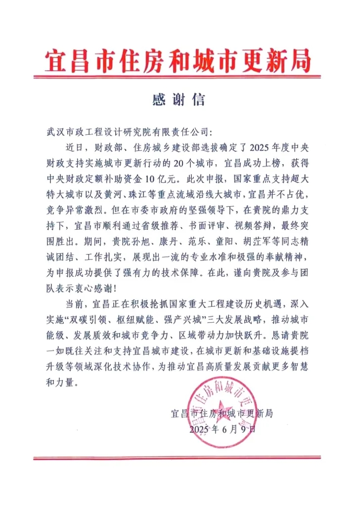 2025年6月4日,國家財(cái)政部經(jīng)濟(jì)建設(shè)司與住房城鄉(xiāng)建設(shè)部城市建設(shè)司聯(lián)合發(fā)布《2025年度中央財(cái)政支持實(shí)施城市更新行動(dòng)評選結(jié)果公示》,湖北省宜昌市成功入圍。武漢市政院作為唯一技術(shù)支持單位助力宜昌成功入選國家支持城市名單,充分彰顯了公司作為城鄉(xiāng)建設(shè)運(yùn)營全過程咨詢智庫的卓越技術(shù)實(shí)力。