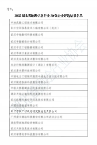 近日,從湖北省測繪行業(yè)協(xié)會傳來喜訊,武漢市政院憑借卓越的技術(shù)實力與行業(yè)貢獻(xiàn),成功獲評“2025湖北省地理信息行業(yè)20強(qiáng)”。這一榮譽(yù)標(biāo)志著公司在測繪地理信息領(lǐng)域的專業(yè)能力獲得省級權(quán)威認(rèn)可,為企業(yè)發(fā)展里程碑再添濃墨重彩。