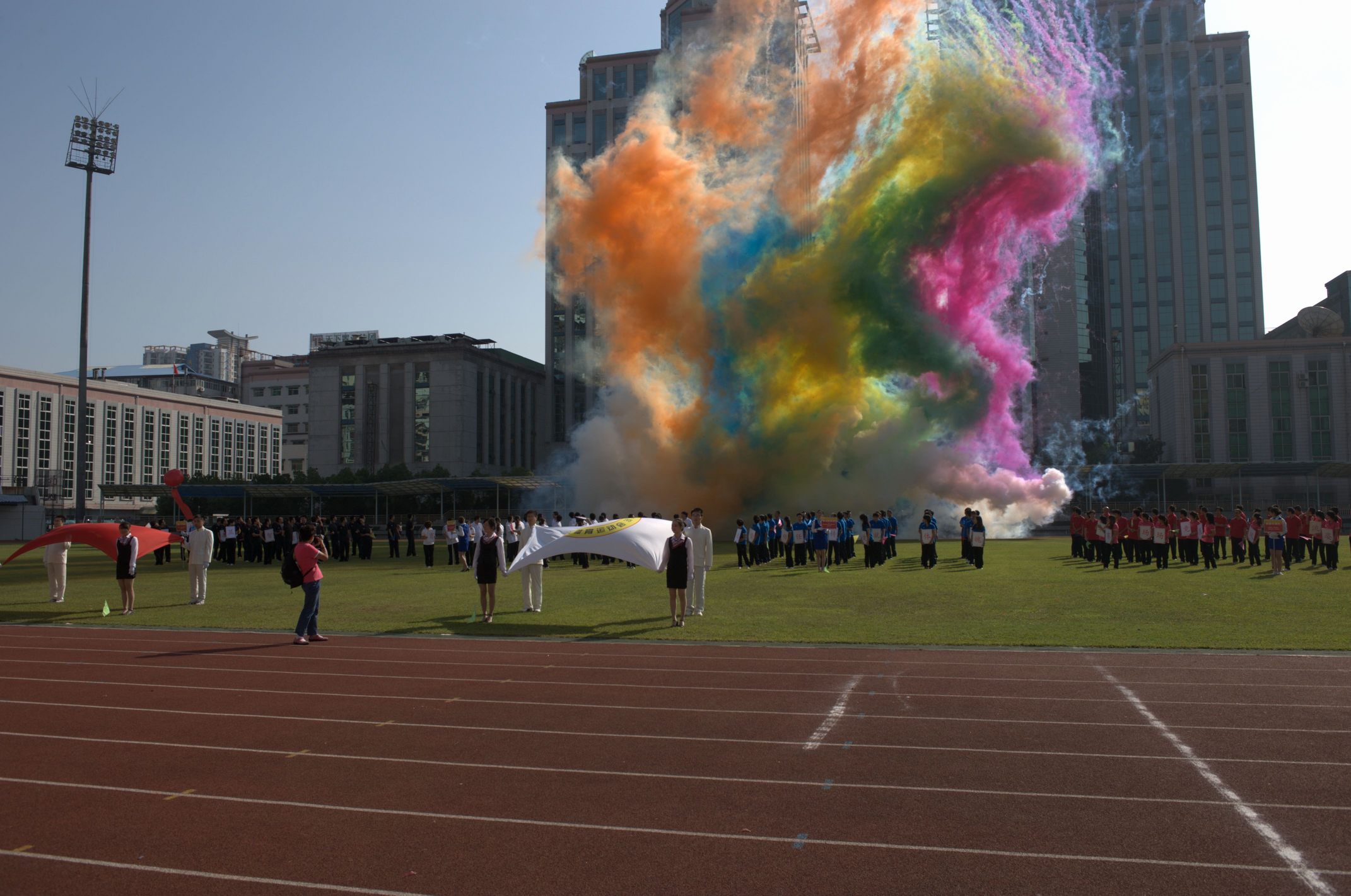 ??? 上午九點(diǎn),開幕式正式開始。在激昂的運(yùn)動(dòng)員進(jìn)行曲中,國(guó)旗方陣和會(huì)旗方陣先后從主席臺(tái)前經(jīng)過,在他們的引導(dǎo)下,四支代表隊(duì)的運(yùn)動(dòng)員方陣依次入場(chǎng),精神抖擻,步伐矯健,展示出了蓬勃向上的精神風(fēng)貌。