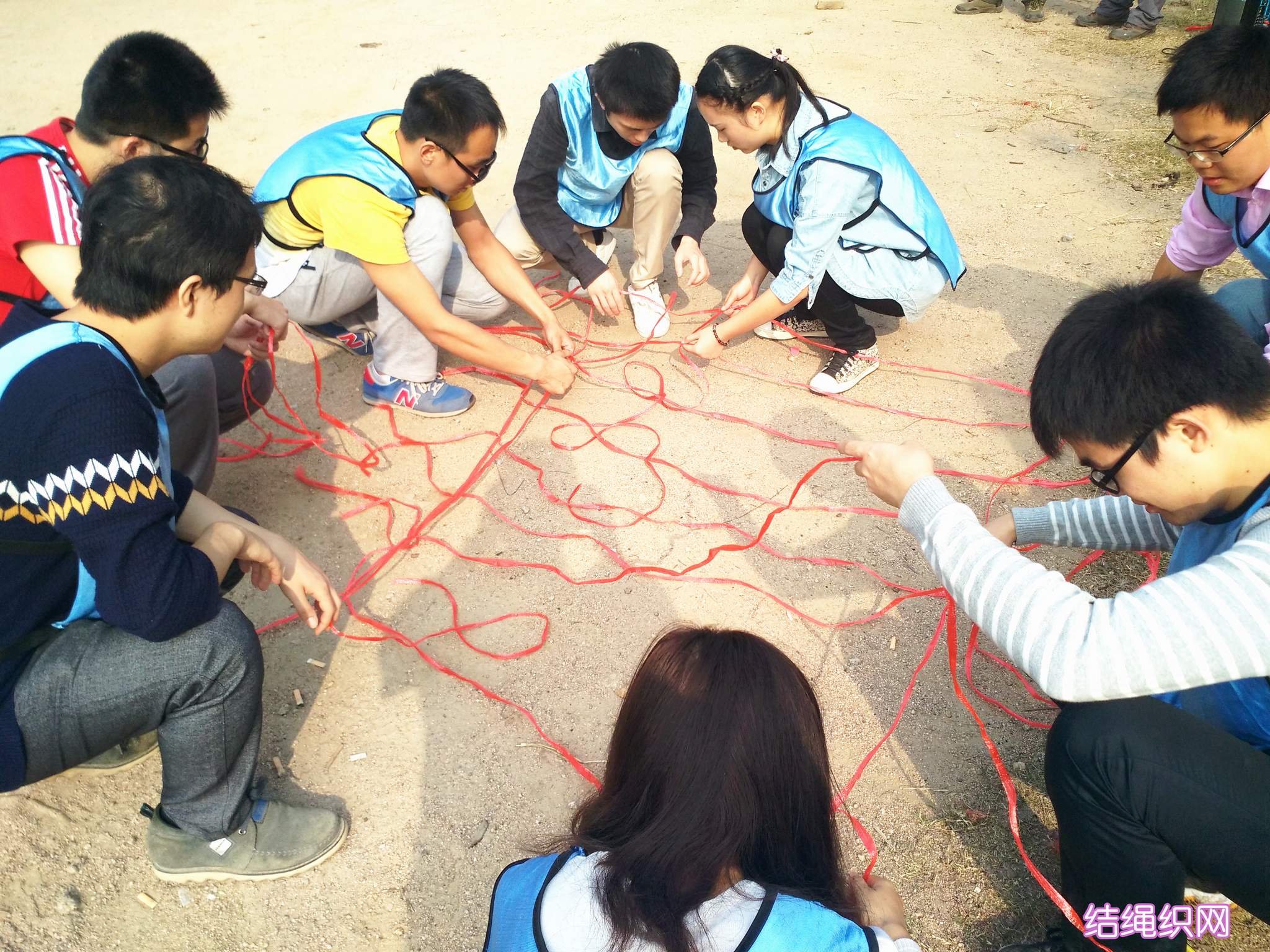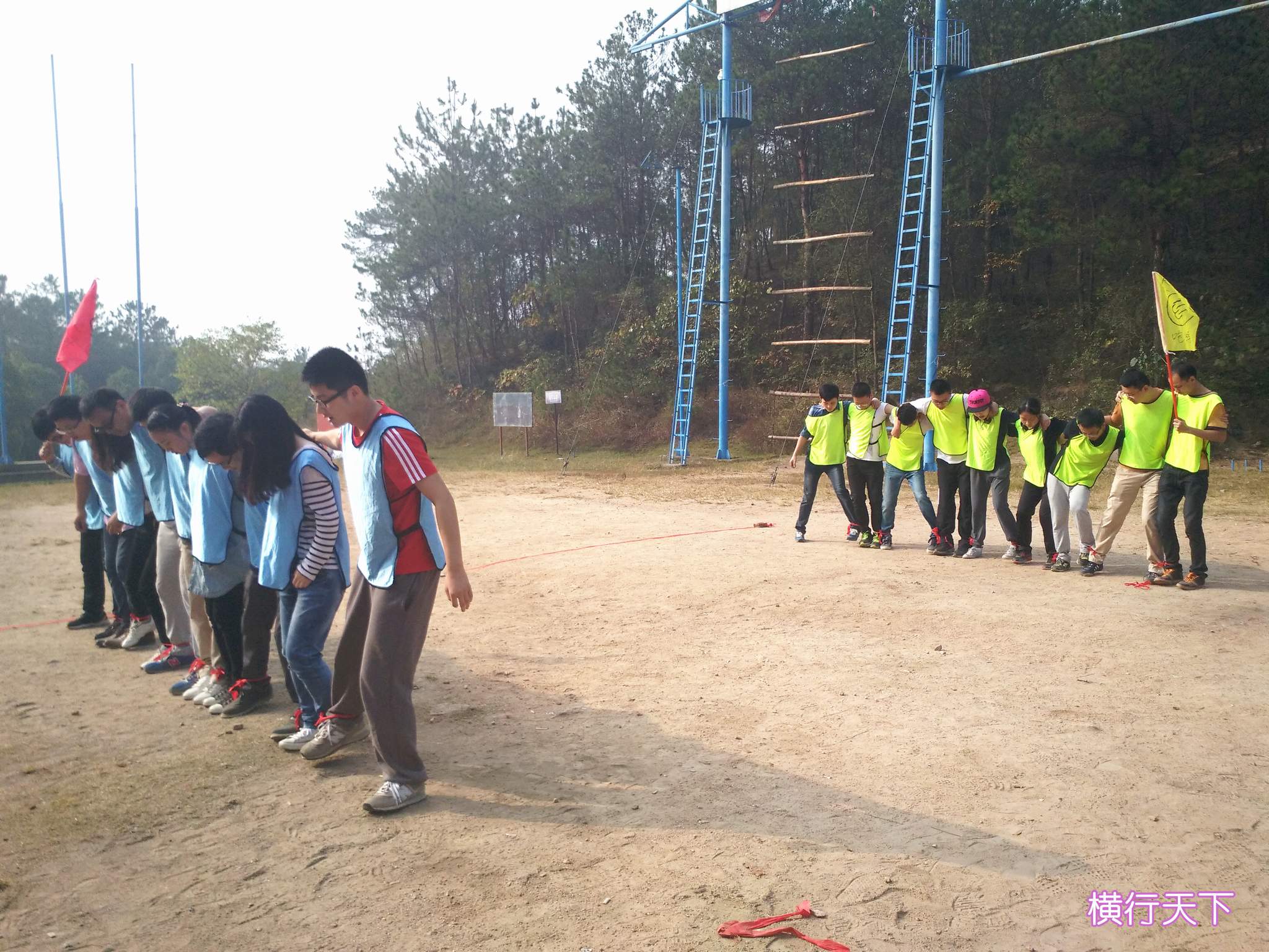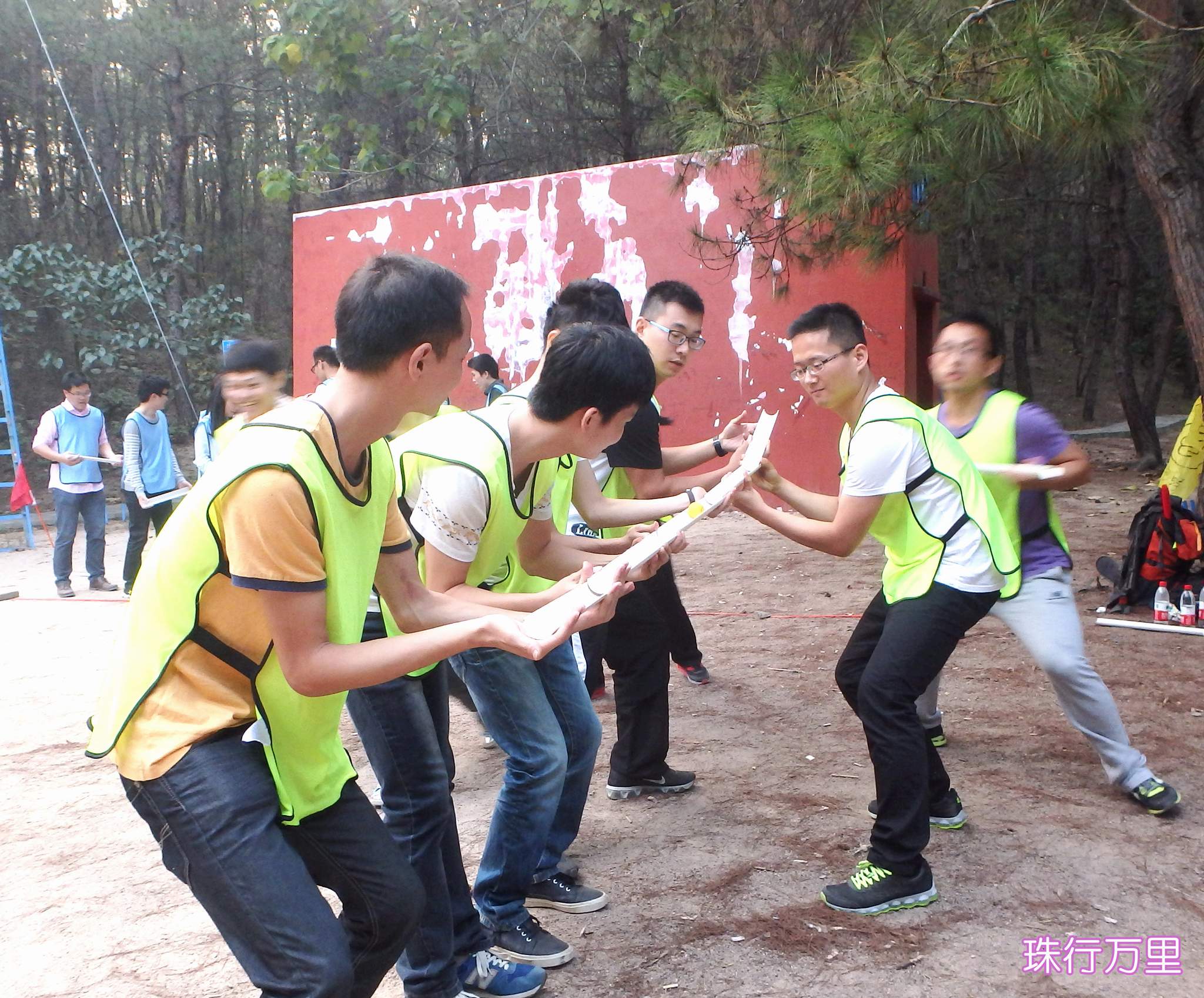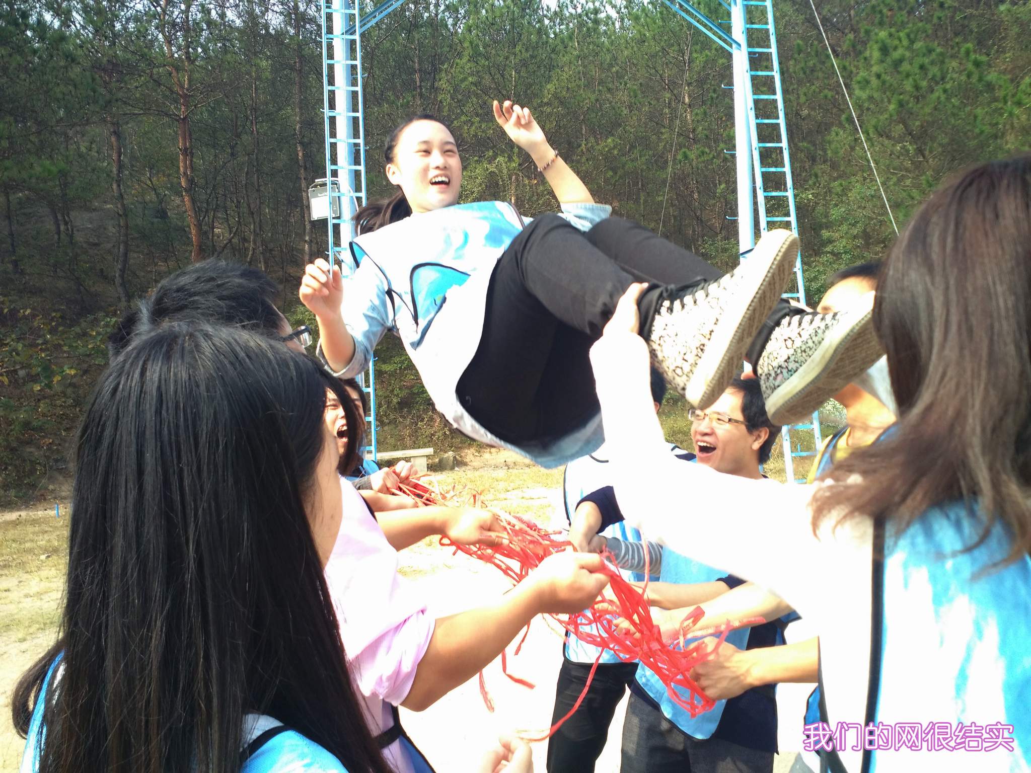 ??? 在抵達活動地點進行了簡單的破冰活動后,新員工們組成了兩支隊伍,并策劃了隊名、隊旗和口號。隨后,在教練員的帶領(lǐng)下,新員工們開始了一系列的拓展活動:“珠行萬里”,隊員們手持半圓形軌道接力將乒乓球運到終點,考驗的是團隊合作能力;“橫行天下”,多人多足的橫向移動,除了默契的團隊配合,也需要一定的技巧;“結(jié)繩織網(wǎng)”,細細的尼龍繩結(jié)成能承受一個人重量的網(wǎng),是對動手能力和創(chuàng)造能力的雙重考驗。