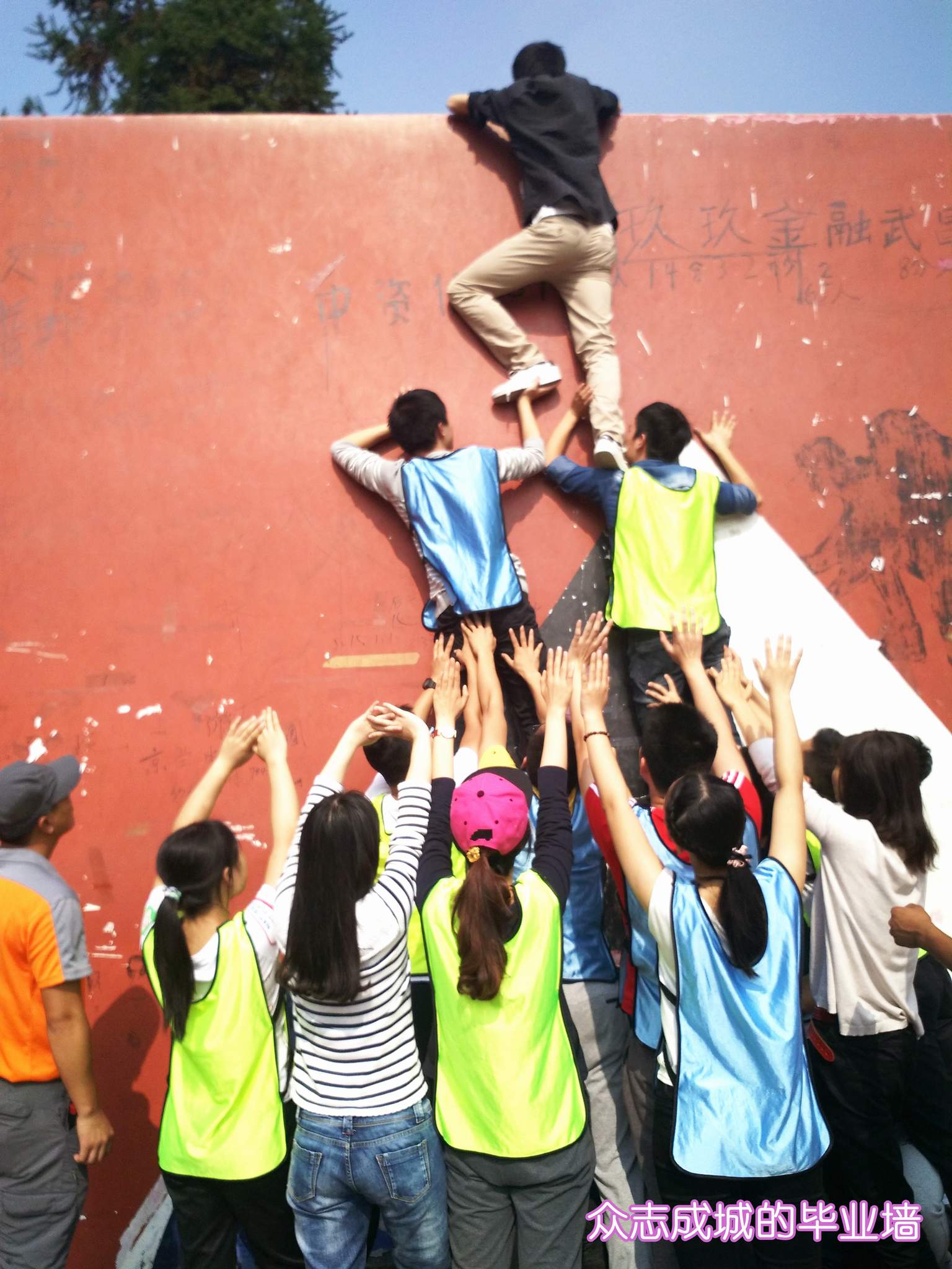 ??? 在最后的“畢業(yè)墻”環(huán)節(jié),大家團結(jié)一心,幾名隊員先是搭起了雙層人梯,將幾名隊員率先送上去,剩下的隊員借助人梯,上面的隊員也是又拉又拽,很快,二十幾名隊員便全部成功登頂。