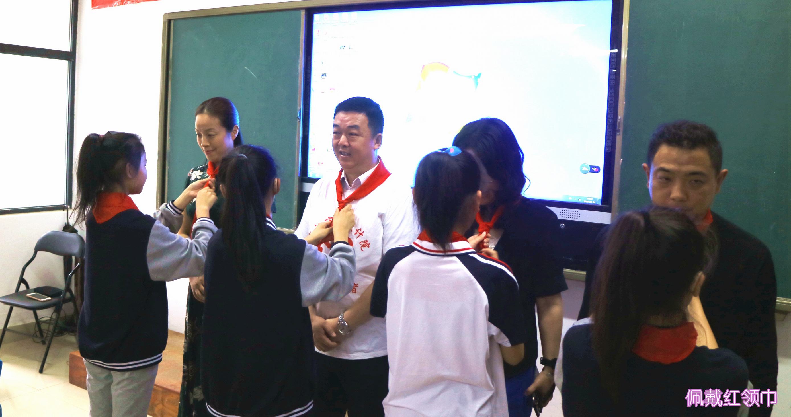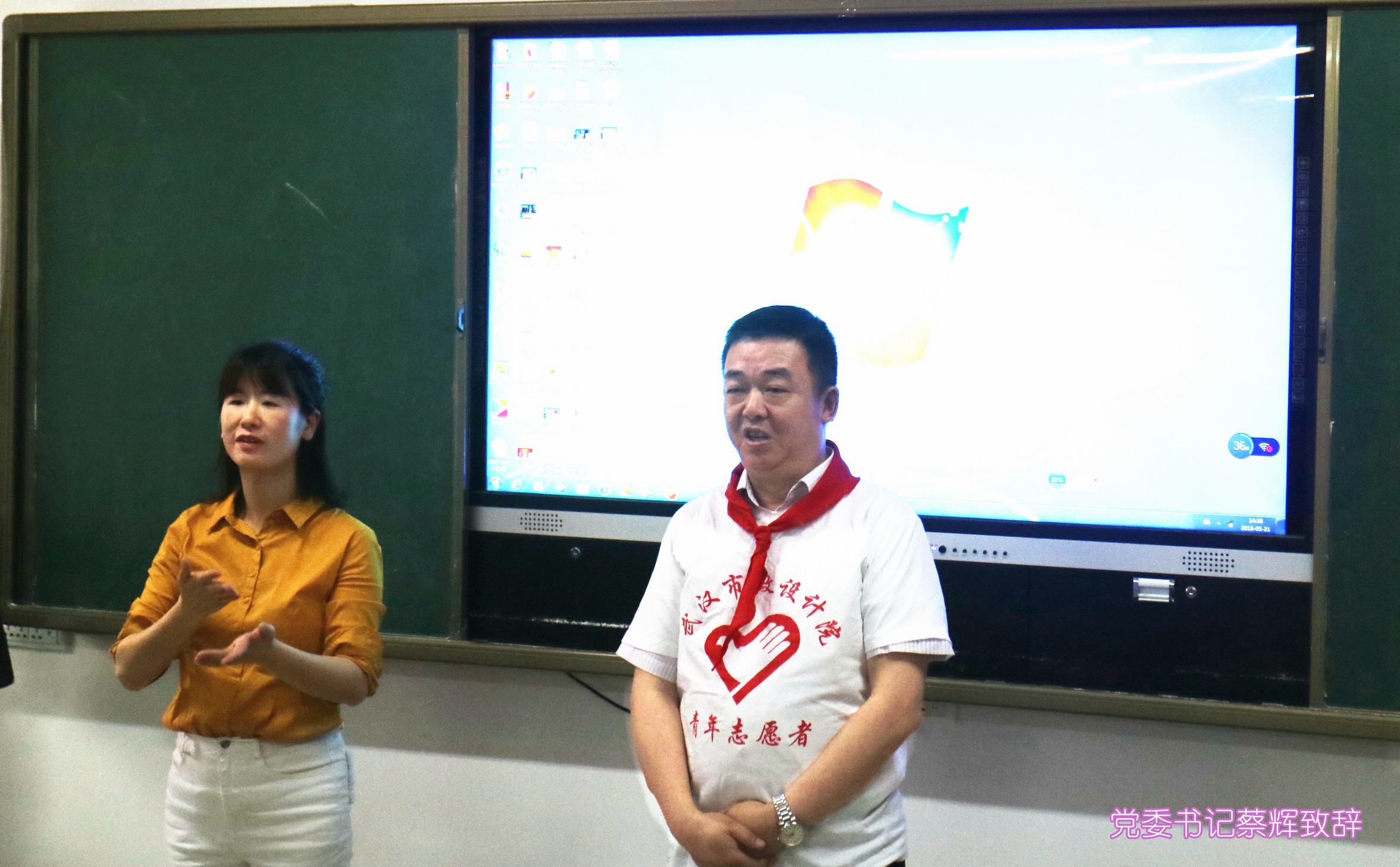 ??? 教室里,志愿者們與孩子們并排而坐,時(shí)而低聲或通過(guò)手勢(shì)進(jìn)行交流。公司黨委書(shū)記蔡輝、團(tuán)總支書(shū)記李俊和學(xué)校黨支部書(shū)記舒敏熠、副校長(zhǎng)吳云鵬、楊小玲、團(tuán)委書(shū)記楊茜等步入會(huì)場(chǎng)時(shí),全場(chǎng)響起熱烈掌聲,學(xué)生代表為他們系上紅領(lǐng)巾,并用少先隊(duì)隊(duì)禮向他們致敬,領(lǐng)導(dǎo)們則豎起大拇指對(duì)他們表示感謝。