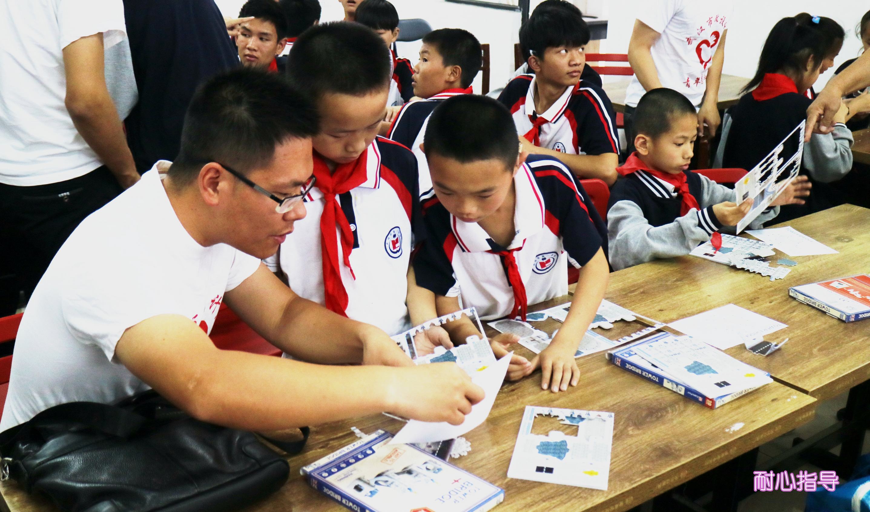 ??? 接下來(lái)的“愛(ài)心課堂”,志愿者們與孩子們共同協(xié)作,進(jìn)行倫敦雙子塔橋模型的拼裝。在志愿者的幫助下,孩子們小心地將圖板拆解下來(lái),按照說(shuō)明書(shū)的圖示認(rèn)真地開(kāi)始拼裝。遇到困難的步驟,志愿者們耐心地給他們講解、示范,在孩子們正確拼裝后,志愿者們會(huì)豎起大拇指對(duì)他們進(jìn)行鼓勵(lì)。很快,一座座模型便在他們手中完成了。最先完成的三組,志愿者們都給他們送上了獎(jiǎng)品。